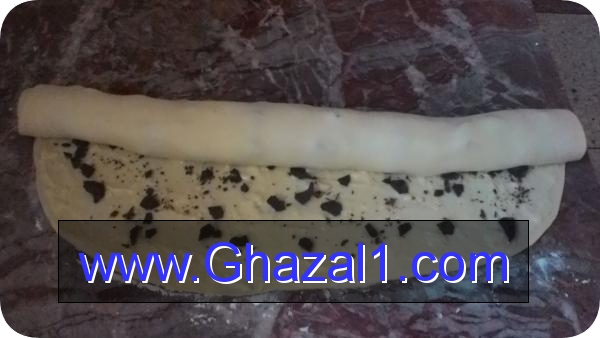 - على طاولة العمل نرش الدقيق ونقوم ببسط العجين بواسطة المدلك ثم نغطي الواجهة الامامية بالكريم باتسييروحبيبات الشكولاطة ونلف العجين لياخد شكل رولو كما هو مبين في الصور.